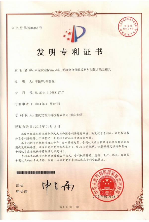 重慶安吉升專利:水泥發(fā)泡保溫芯料、無機(jī)復(fù)合保溫板材與制作方法及模具 CN104478354B 發(fā)明專利 公告日期2017-01-18